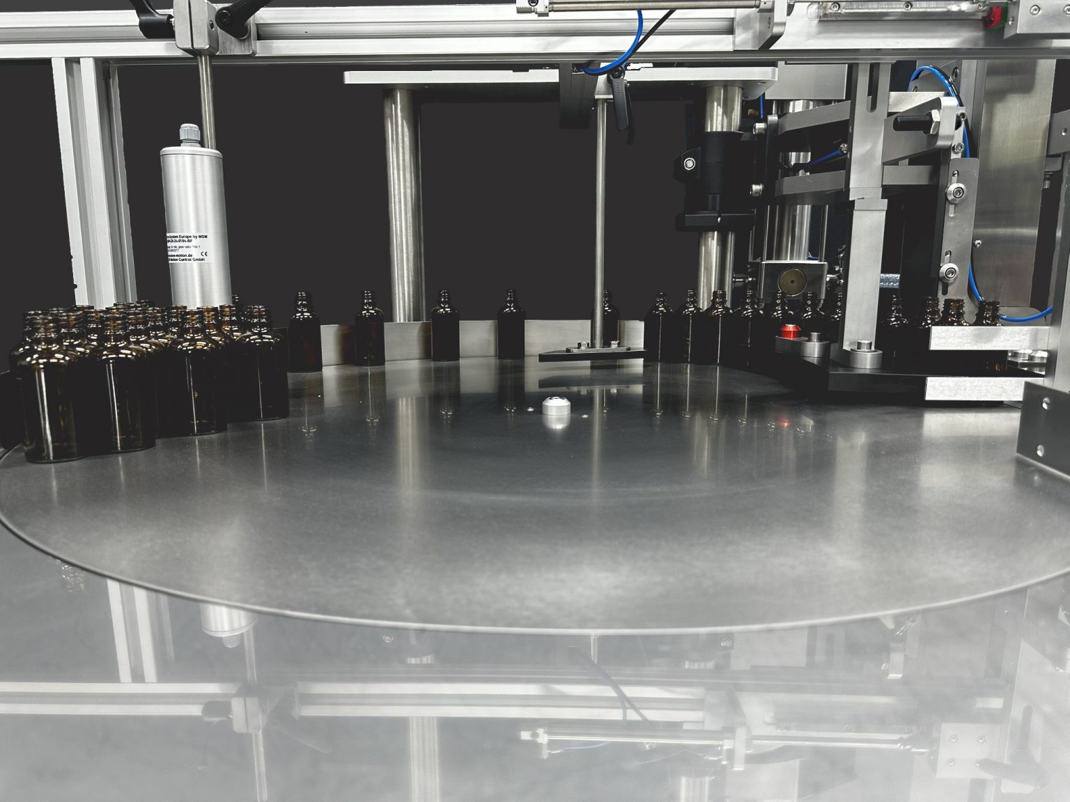 Die Dosieranlage ET 800 besitzt einen zentralen Drehteller mit einer auf die unterschiedlichen Behälter einstellbaren Vereinzelung. Der Transport in die Dosierposition erfolgt automatisch. Die Sicherheitsfunktion der Fülldüse mit pneumatischer Tauchbewegung vermeidet Fehldosierungen.