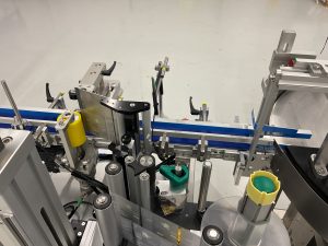 Etikettierstation transportiert. Sobald ein Produkt einläuft, wird es automatisch erkannt und pneumatisch an der Etikettierposition zentriert.Bereits während des Etikettiervorgangs erfolgt eine integrierte Prüfung, bei der das Etikett auf definierte Qualitätsmerkmale kontrolliert wird.